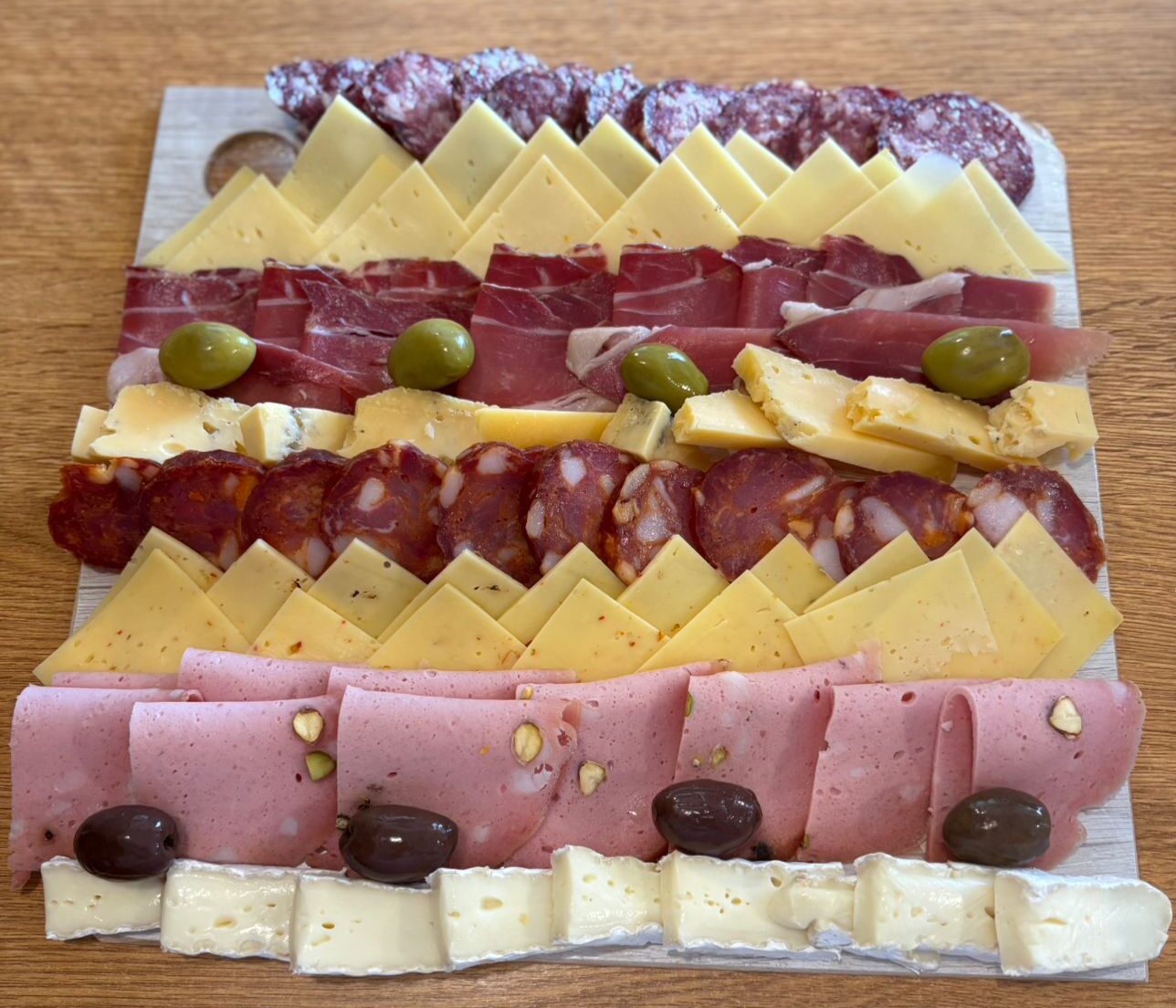 Jamón crudo ahumado/Mortadela con pistacho o nuez/Chorizo Alemán/Queso saborizado/Queso Banquete/Queso Brie/Queso Morbier/Salame Cular