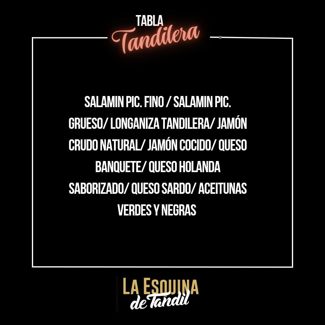 Salamín picado fino, salamín picado grueso, longaniza tandilera, jamón crudo natural, jamón cocido, queso banquete, queso holanda saborizado, queso sardo, aceituna verdes y negras.